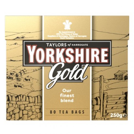 Yorkshire Gold Tea - The "Gold" is Taylors of Harrogate's 'Extra Rich Luxury Blend' tea and is made from 20 specially selected tea gardens to give the tea its distinctive strength and flavour!  Box contains 80 tea bags.