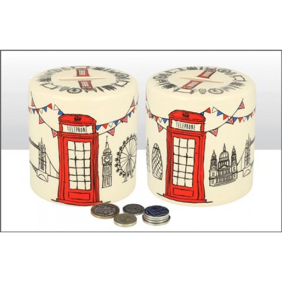 This ceramic money box with Sketchy Design features iconic images of London including Big Ben, Tower Bridge, the Tower of London, the London Eye, the Gherkin and an eye-catching British red Telephone Box.